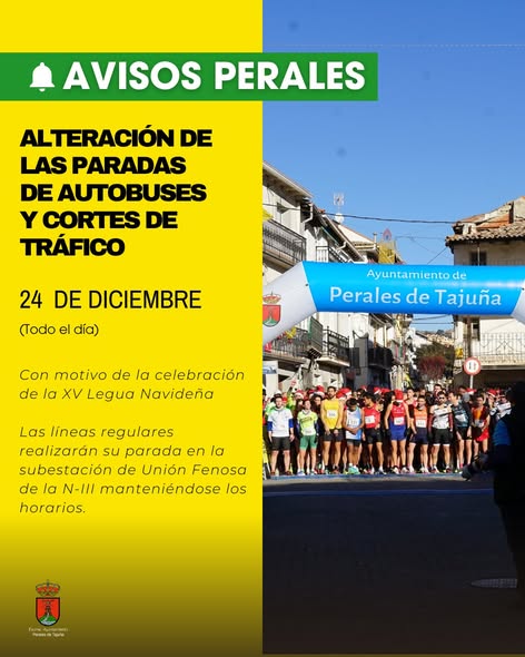 E ste miércoles 24 de diciembre, con motivo de la celebración de la XV Legua Navideña, las líneas de autobuses regulares trasladarán su parada a la subestación de Unión Eléctrica Fenosa, ubicada en la Carretera N-III, manteniendo los horarios habituales. Asimismo, se establecerán cortes de tráfico temporales en las siguientes zonas: