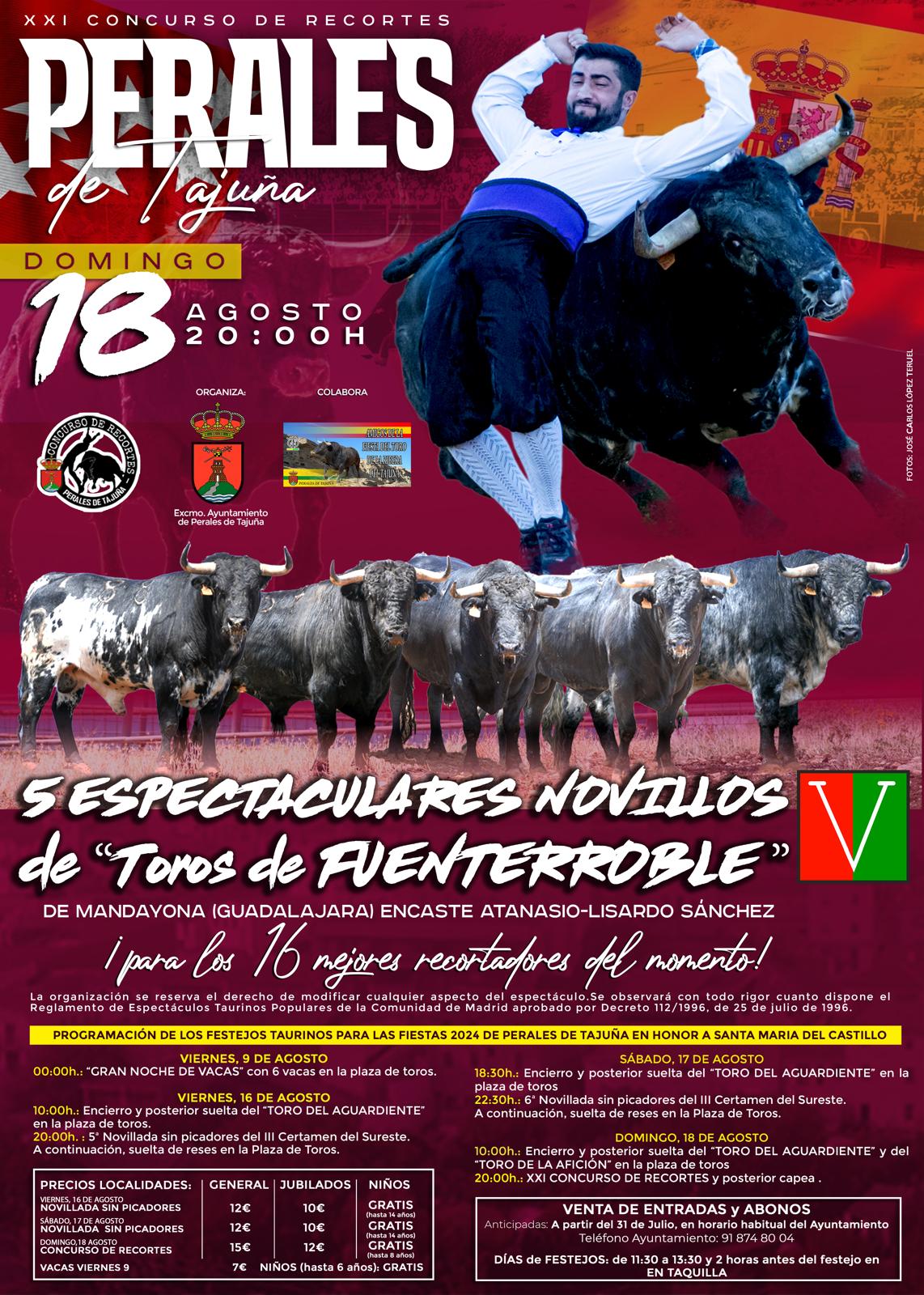 Hasta nueve festejos taurinos se llevarán a cabo en Perales de Tajuña durante las Fiestas Patronales 2024. Desde los tradicionales encierros hasta las novilladas de la III edición del Certamen del Sureste, así como el Concurso Nacional de Recortes, que celebra su vigésima primera edición, una gran noche de vacas y actividades diseñadas para niños.