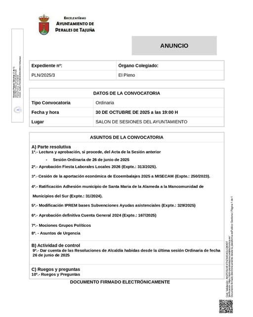 C onvocado un Pleno Ordinario del Ayuntamiento de Perales de Tajuña para este jueves, 30 de octubre a las 19:00 horas, con los puntos que figuran en la convocatoria.