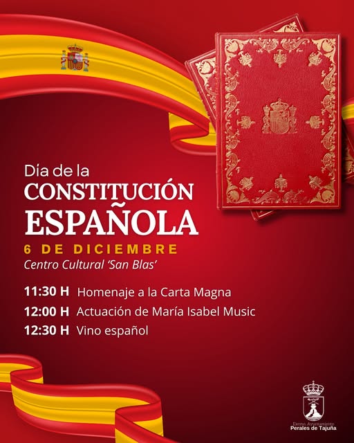 P erales de Tajuña no faltará a su cita con la Constitución Española. Será el próximo 6 de diciembre, en el Centro Cultural 'San Blas' cuando se rinda homenaje a la Carta Magna en su XLVII Aniversario, con la tradicional lectura por parte de las misses y misters de las Fiestas y la posterior actuación de nuestra vecina Mª Isabel a la que seguirá un vino español para todos los asistentes.