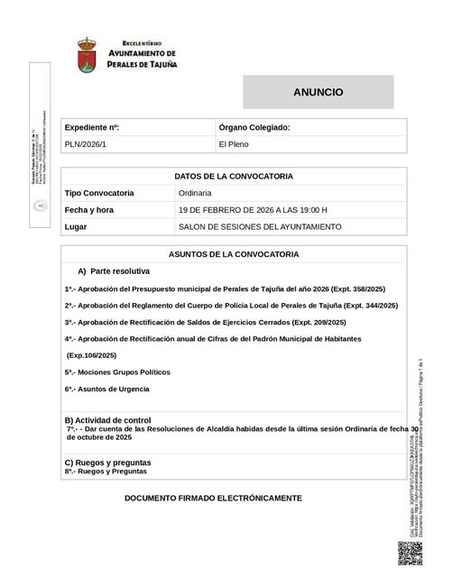 C onvocado un Pleno Ordinario del Ayuntamiento de Perales de Tajuña para este jueves, 19 de febrero, con los puntos que figuran en la convocatoria.