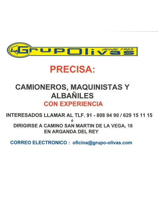 L a empresa Grupo Olivas busca incorporar a su equipo camioneros, maquinistas y albañiles con experiencia. Los interesados pueden contactar en los teléfonos 91 808 94 90 o 629 15 11 15, o dirigirse directamente a sus instalaciones situadas en Camino San Martín de la Vega, 18, de Arganda del Rey.