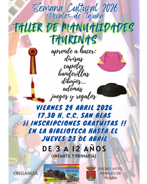 D iversión y creatividad para los más pequeños. La Semana Cultural de Perales de Tajuña trae un taller de manualidades taurinas organizado por la Asociación Taurina Amigos de la Fiesta del Toro de la Ribera del Tajuña, donde niños de 3 a 12 años podrán crear sus propias divisas, capotes, banderillas y dibujos ¡Una tarde para pasarlo en grande!